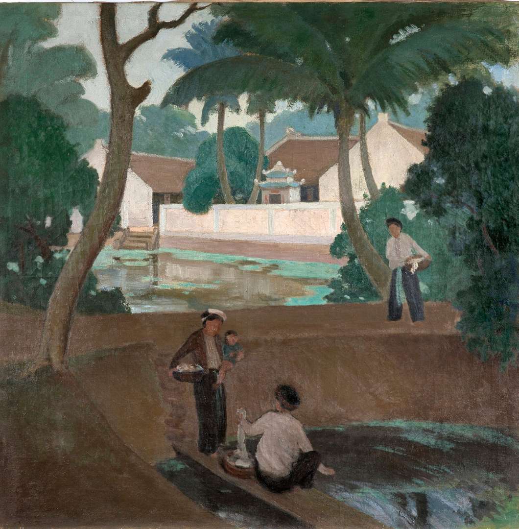 Les enseignements de l’École des beaux-arts de l’Indochine et les thèmes de prédilection de Nguyễn Phan Chánh se mêlent. Ainsi, cette oeuvre est peinte à l’huile sur toile, technique apprise lors de ses années sous la direction de Victor Tardieu. Elle représente une scène quotidienne, dans la campagne : Nguyễn Phan Chánh affirme tôt son goût et son intérêt pour le monde rural et les scènes de vie quotidiennes et traditionnelles. En témoigne Deux femmes dans une barque, soie contemporaine à notre tableau, réalisée en 1932, où le sujet choisi est typique de l’artiste (repr. p. 40).
