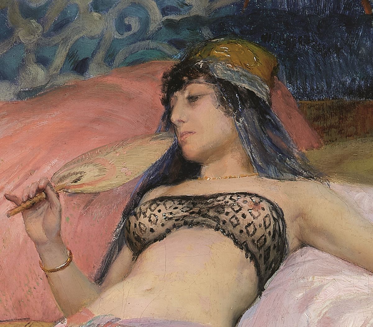 Sarah Bernhardt dans un intérieur chinois (vers 1900, coll. part.), qui décrit l’actrice à la « divine crinière de déesse » (Banville) dans la robe asiatique de soie brodée dont elle aime à se vêtir, tant à Paris qu’à Belle-Île-en-Mer. Elle a également donné à voir une