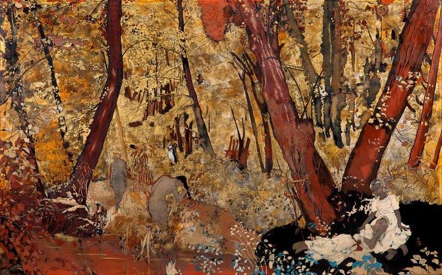While staying in Japan in 1928, the artist, who had been living in Hanoi for seven years, discovered such a passion for lacquer that she specialised in the technique from then on. When she and Inguimberty introduced the art of lacquering to the School in 1934, her works reflected a strong Art Deco influence. She borrowed the backgrounds and broad flat tints in gold from Japanese lacquers, traditional subjects from Indochinese lacquers, and modernity from the West, creating a sublime and perfect symbiosis. This lacquer is a marvellous depiction of the Vietnam idealised and adored by the artist, showing her vision of the earthly paradise. Like Gauguin who found inspiration in Tahiti, Alix Aymé’s art blossomed on her contact with Asia. The slender, dream-like forms of young women emerge from the golden tones of the lacquer with poetic constraint. The viewer is immersed in a delicate vision, soothed, protected and comforted by luxuriant, abundant vegetation that leaves no room for the sky or any intruders.