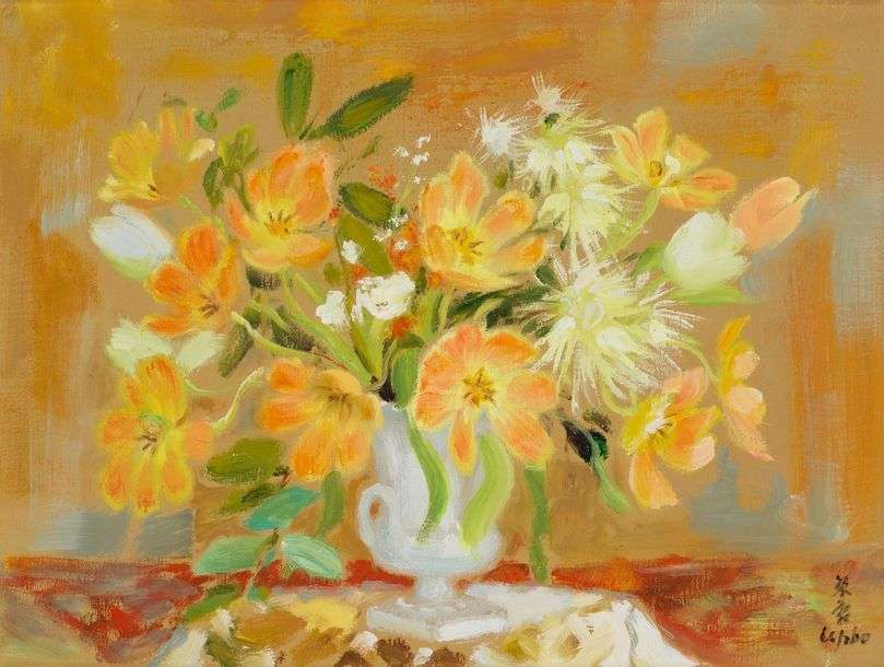 Floral compositions in oils are prominent in Le Pho’s work, and synthesise the artist’s heritage of decorative Vietnamese canons and Western pictorial aesthetics. The Bouquet de Fleurs here clearly shows the influence of the Impressionists. Liberated by this medium, the artist expresses himself more spontaneously and intuitively, while maintaining a keen precision. The lively palette of the orange background brings out the intensified motif of the delicate flower petals, giving the work a particularly harmonious and poetic feel.