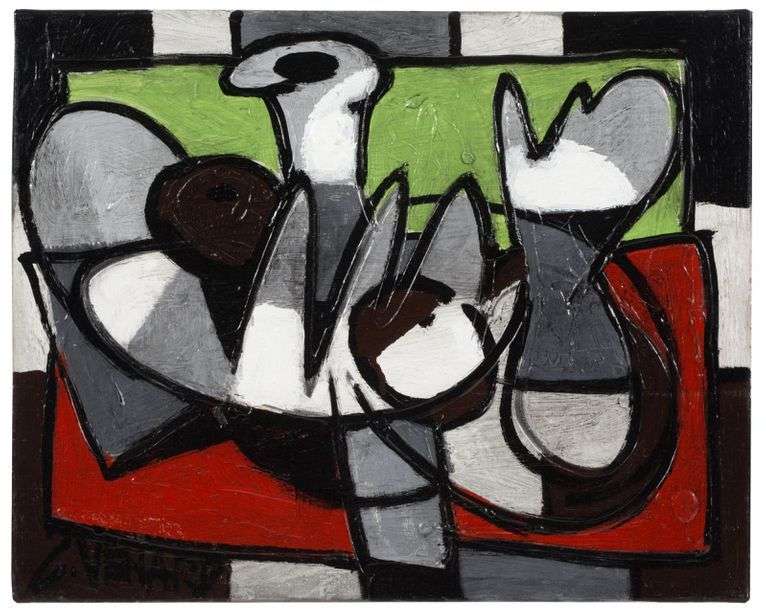 Lemons reveals Cézanne’s influence on Venard. The flat colours and a much more pronounced Cubist style, also called postCubism, can be found here. As in all of his work, the colours are sharp, vivid, bright and enhanced by absolute black contours and shadows.