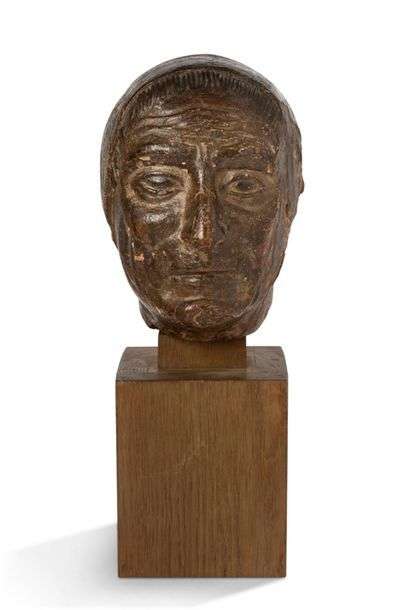TÊTE DE FEMME en terre cuite polychromée à la chevelure relevée retenue pa