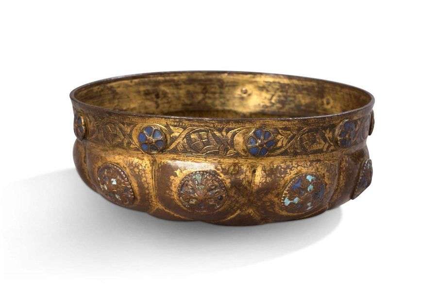 TOMBAK CUTTING with enamel decoration. Gilded copper tombak cup moulded with gadroons and with riveted decoration of blue enamelled cabochons in the shape of rosettes. Under the lip, a chiselled frieze of vegetal foliage alternating bifid palmettes and flowers in bud.Eastern Turkey, Diyarbakir, late 18th - early 19th century