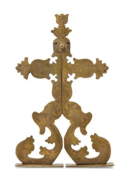 Curieuse croix en laiton joliment gravée de feuillages qui se déplie pour