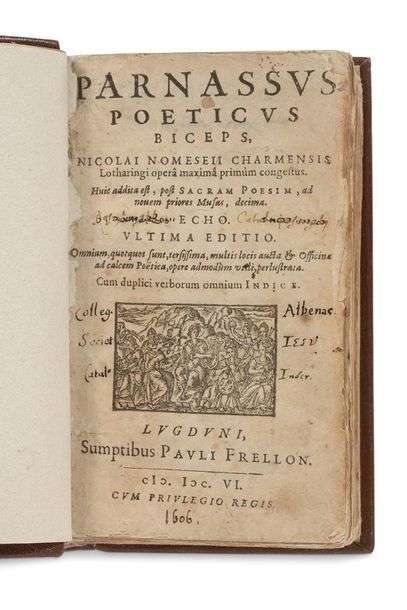 Edition of this collection widely distributed in the 17th century since its first edition in 1595. The Parnassus poeticus had about twenty-five editions in France between 1609 and 1625.