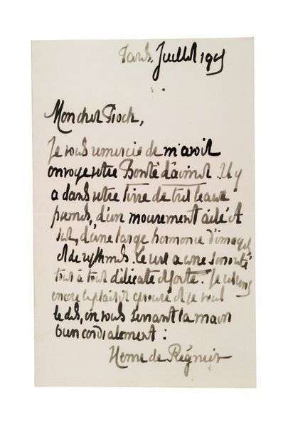 - une lettre de Henri de REGNIER à Georges Pioch, le remerciant pout l'envoi de son livre (1 pp. in-8)