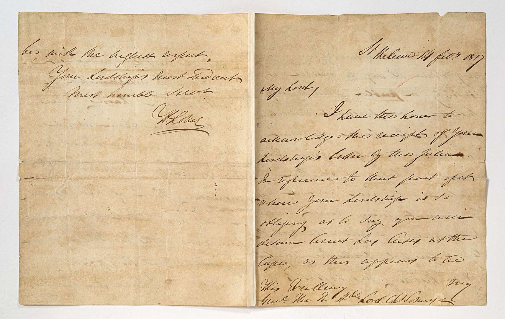 Cette lettre de la main de Hudson Lowe, Gouverneur de Sainte-Hélène et « geôlier de Napoléon », est adressée à Lord Charles Somerset, Gouverneur de la Colonie du Cap, en Afrique du Sud. Elle est relative à la déportation du Conte Emmanuel de Las Cases au Cap, après son expulsion de Sainte-Hélène, expulsion dont les raisons précises sont toujours inconnues. Hudson Lowe, dont on sait la dureté de son traitement envers l’Empereur, semble ici se défendre de quelque hostilité que Lord Somerset lui supposerait à l’égard du Conte. Il y fait entre autre référence aux fondements sur lesquels il déclare avoir voulu l’expulser de Sainte-Hélène, arguant qu’ils sont de Droit public, et à la nécessité de l’empêcher de regagner l’Europe dans l’attente d’une décision du Gouvernement de la Couronne à son encontre.