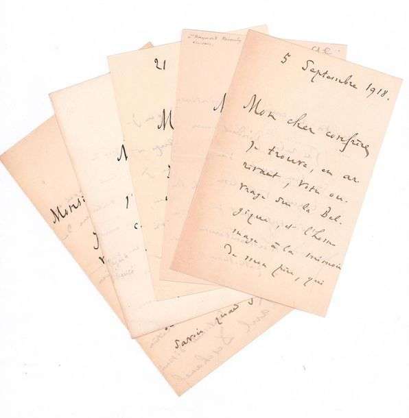Au fond d'une campagne quand la catastrophe s'est produite [l'incendie du Bazar de la Charité], « j'apprends seulement aujourd'hui que Madame de Grouchy a reçu des brûlures » | il demande des nouvelles et souhaite une prompte guérison... 21 avril 1913, [à Renée de BRIMONT] : en lisant ses Tablettes de cire, il passe « des moments divins ! »... 21 février 1914, à un « très honoré confrère » qu'il désire voir... 27 mai 1916, à son ami Jean LÉRY : « Je lis votre Bataille dans la forêt avec une émotion croissante. C'est un admirable récit, d'une vie et d'un mouvement intenses, digne de cette guerre héroïque ! »... 5 septembre 1918, à son confrère Georges GOYAU], sur son ouvrage sur la Belgique [L'Unité belge et l'Allemagne], « et l'hommage à la mémoire de mon père, qui me va au coeur. J'ai relu, pendant ces trop courtes vacances, votre livre si intéressant : Humanitarisme et patriotisme | vous y parliez du fils comme vous parlez du père | je vous remercie pour les deux, de tout coeur »...
