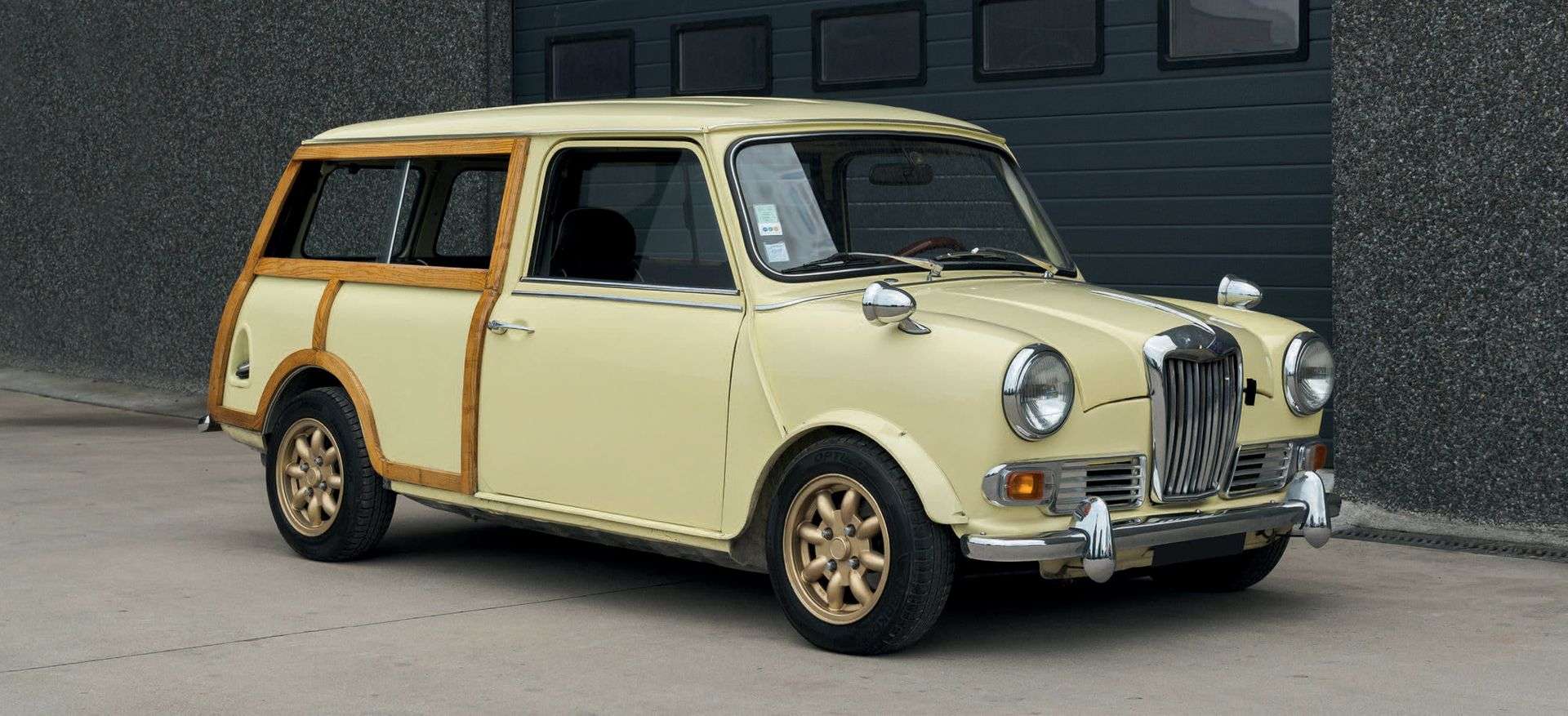 The iconic Mini produced more than five million units between 1959 and 2000 is no longer presented. From May 1960, the range proposes a version Van for the professionals, with a wheelbase lengthened of 7,5 cm. This version was so successful that a 4-seat, glass-walled estate, called the Coutryman and Traveller (at Morris), was launched a few months later. In 1969, after 207,000 units, the new Mini Clubman Estate (197,606 units until 1982) replaced it. It is one of these Clubman Estate, in 1000 version (998 cc) that illustrates these pages. The car, unique, was modified with the front of a Riley Elf, a more prestigious version of the Mini, which was distinguished by its three-body volume, its level of finishing and this famous elegantly outdated grille. By the way, the yellow colour of this original modified Mini Clubman is also reminiscent of the exclusive Chartreuse Yellow of these Rileys. The car has not been used for two years and will need a service before being driven again.