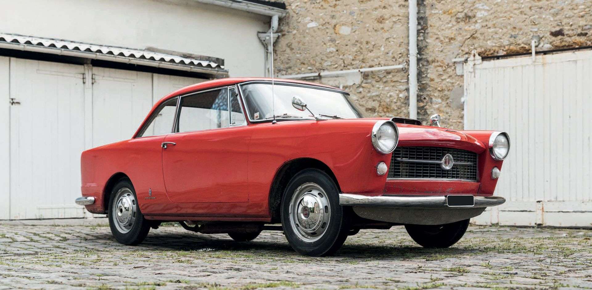 The car shown here is one of these very rare Pinin Farina versions, built as a 4-seater coupé on a Fiat 1200 base. According to the brochure of the time, "the most important difference" with the 2-seater coach "is in the roof which, being larger, allows interior space for four people. The front seats are separate and independent: when the backrests are folded forward the seats themselves move forward automatically to allow easier access to the rear seats." The bodywork, like the doors, is made of steel, except for the rear trunk... made of fiberglass! The dashboard, "special, is painted in anti-reflex varnish." Chassis #423 052 was sold new in Sweden. Its second owner, Mr Nicklasson, passed a last technical check-up in 1970, before storing the car for several decades. Originally light blue, it was repainted in red probably before its long immobilization. The car, rediscovered in 2017, was restarted just before the sale. It is now in an advanced state of use, and although it is still running, it will need a restoration worthy of its rarity and historical interest.