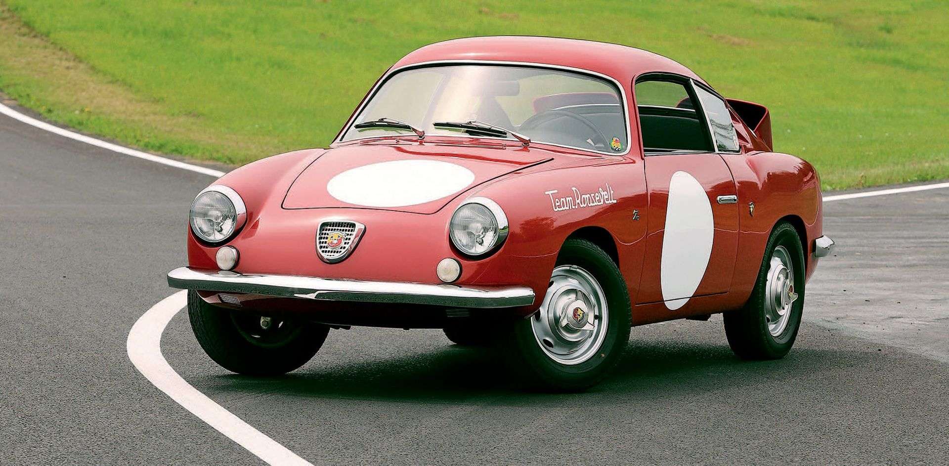 In the mid-1950s, Carlo Abarth, the famous Italian wizard, set his sights on the brand new Fiat 600. With four large Borgo pistons and a re-bore to reach 747 cc, a home-made intake pipe to bolt on a Weber 32 carburettor and a "competizione" air filter and a custom-made marmita (Abarth's trademark), the Fiat 600 Gran Turismo derivazione Abarth wasted no time in making a splash in the 750 class competitions and on the road! In April 1956, at the Salone dell'automobile in Turin, Carlo Abarth presented a small, elegant Zagato saloon car based on the Fiat 600 platform and its famous 750 preparation. This first version, called the 750 GT, was distinguished by the famous double bubble roof that Zagato loved and which gave the model its credentials, with a three-peat in the 750 class at the 1957 Mille Miglia and numerous victories in the 750 class on the Old Continent and in the United States, where the bombshell was a great success in the SCCA (Sports Cars Club of America) championship. With 44 hp and 535 kg on the scale, the little scorpion all in aluminium propels its occupants to 160 km/h. In 1958, a bialbero version named Record Monza (with a home-made double ACT cylinder head that allows to get 61 hp out of the little 4-cylinder) even promises 180 km/h ! In 1959 and 1960, to complete the series, twenty-five more cars were produced by Abarth and Zagato, with steel bodies and aluminium doors. Called Sestriere (in reference to the highly selective Sestriere rally, which took place around the eponymous ski resort and where the Zagato 750s won in 1958 and 1959), and featuring a "flat" roof and two enormous scoops on the rear bonnet, these were the rarest of the line.