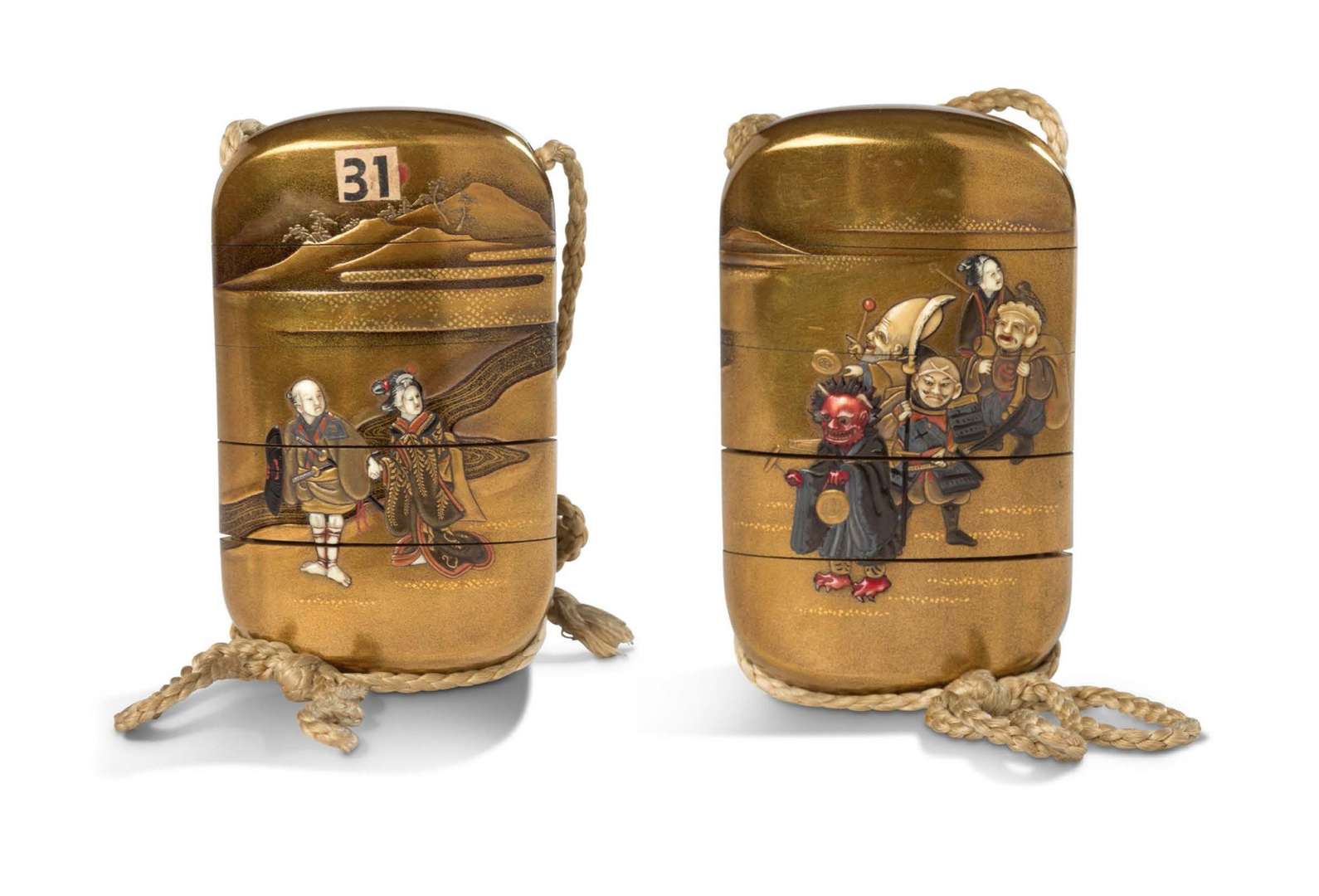 Inrô with four squares, made of kinji lacquer, decorated with iroe-takamakie, takazogan, togidashi and kirigane, one side decorated with a procession led by an oni dressed as a monk, striking a gong, followed by a samurai and three gods of happiness, the other side depicting a couple at the edge of a river in a mountainous landscape| the interior made of nashiji lacquer and fundame.