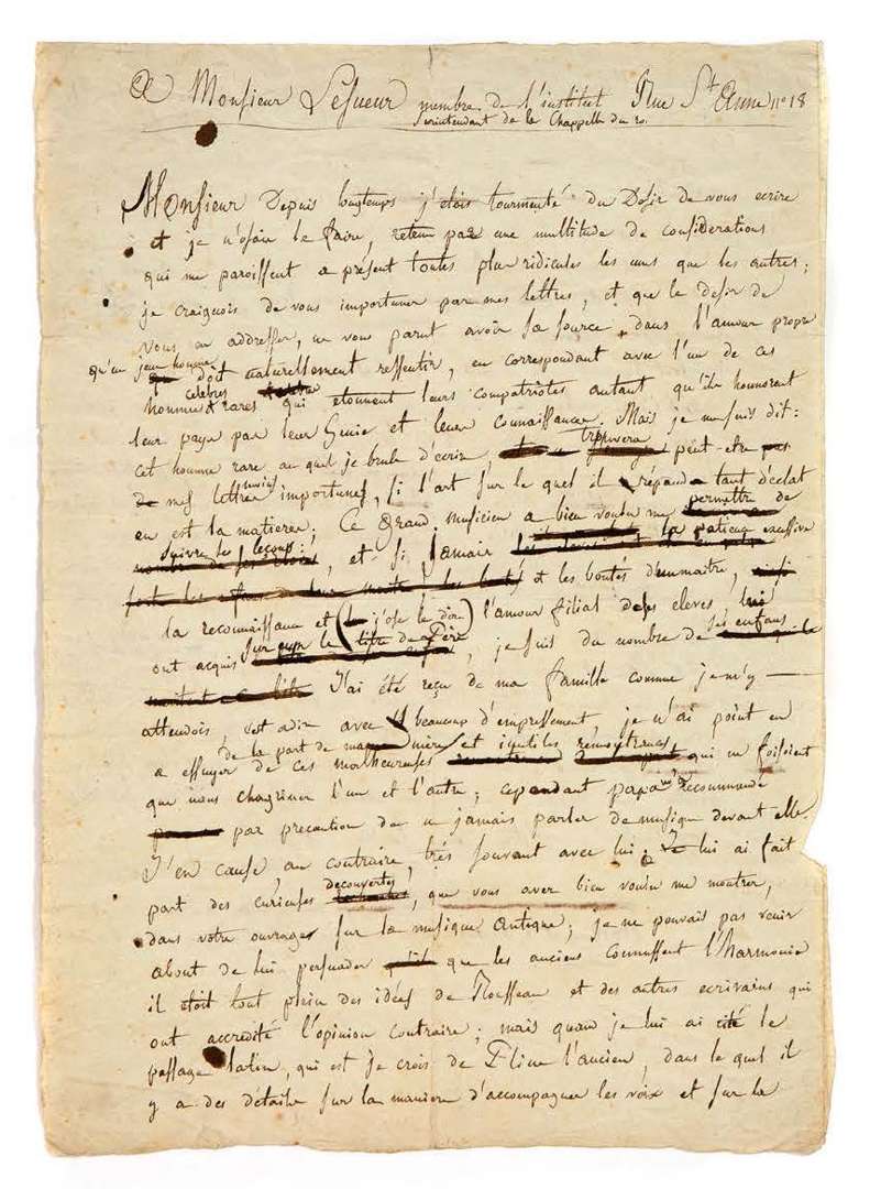 Le Passage de la Mer Rouge, which are among his earliest compositions]. "For a long time I had been tormented by the desire to write to you and I did not dare to do so, held back by a multitude of considerations which now seem to me all more ridiculous than the others| I feared to bother you with my letters, and that the desire to send you some, did not seem to you to have its source in the self-love which a young man must naturally feel, in corresponding with one of those famous and rare men who astonish their compatriots as much as they honor their country by their Genius and their knowledge. But I said to myself: this rare man to whom I am burning to write will perhaps find my letters less troublesome, if the art on which he spreads so much brilliance is the subject.