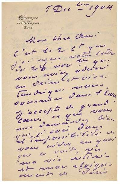 L.A.S. «Claude Monet», Giverny 5 décembre 1904, à un «cher ami» | 1 page et demie in-8.