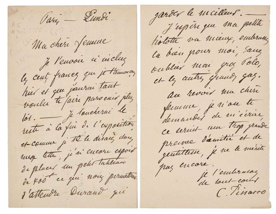 L.A.S. «C. Pissarro», Paris Lundi [14 juin 1888], à SA FEMME JULIE | 5 pages in-8.