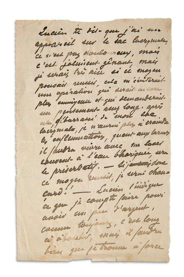 Sur ses problèmes d'yeux. [Pissarro a souffert des yeux les vingt dernières années de sa vie | il était soigné par le Dr Parenteau.] «Lucien te dit que j'ai un appareil sur le sac lacrymal, ce n'est pas doulou­reux, mais c'est joliment gênant, mais je serais très aise si ce moyen pouvait réussir, cela m'éviterait une opération qui serait encore plus ennuyeuse et qui demanderait un pansement assez long. Après cela, débarrassé de mon sac lacrymal, je n'aurai plus à craindre les inflammations, quant aux larmes il faudra vivre avec me laver souvent à l'eau bhoriquée, sera le préservatif. - Si ce moyen réussit, je serai chançard ! - Lucien t'indique ce que je compte faire pour avoir un peu d'argent, comme toujours, c'est long à aboutir, mais il faudra bien que je trouve à force de chercher. - J'ai tous les jours des projets. - Quelques Américains sont ici, je vais tâcher de les voir et faire affaire. [...] Embrasse bien les enfants pour moi, - la grand-mère est toujours au plus bas, elle s'affaiblit de jour en jour»....
