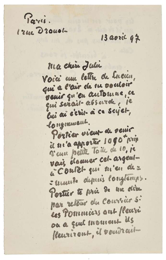 L.A.S. «C. Pissarro», «Paris 1 rue Drouot» 13 avril 1897, à SA FEMME JULIE | 1 page et demie in-8. «Ma chère Julie Voici une lettre de Lucien qui a l'air de ne vouloir venir qu'en automne, ce qui serait absurde, je lui ai écrit à ce sujet, longuement.