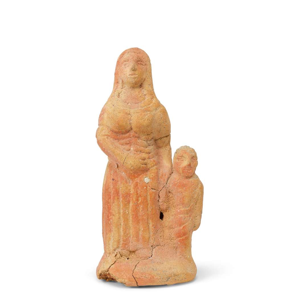 STATUETTE VOTIVE d'une femme tenant un enfant par la main, terre cuite ple