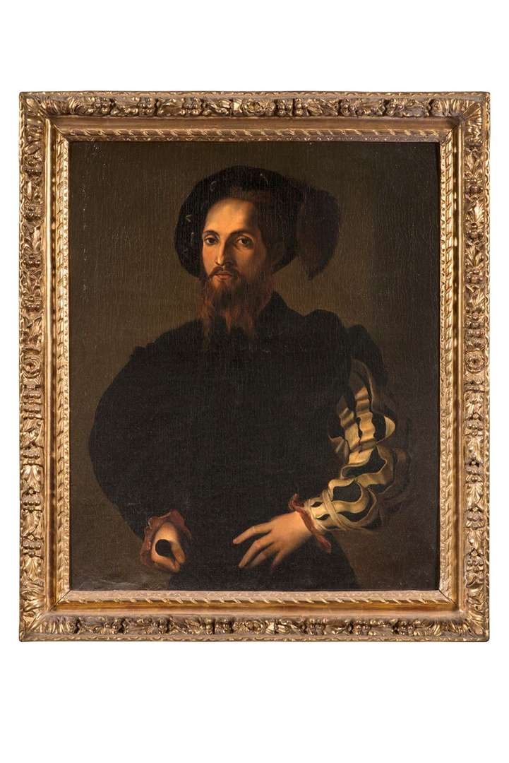 The physiognomy of Cesare Borgia, one of the most illustrious members of the dynasty, is paradoxically little-known. The identity of the famous late portrait (circa 1515) of a gentleman preserved at the Accademia Carrara in Bergamo and attributed to Altobello Melone (ca. 1491 - 1543) remains uncertain. Considered by some authors to be by Sebastiano del Piombo (1485 - 1547), but previously also by Raphael (1483 - 1520) himself1 , the Half-body Portrait of Cesare (Paris, Rothschild Collection) is perhaps the most likely evidence of the pope's son's physical identity. Although there are several variants or versions of this portrait, including those in the Castello di Miramare and the Palazzo Reale in Turin, the present painting, which has never been seen before, is one of the finest. In 1851, Gustave Flaubert (1821 - 1880) harshly described the composition of the Miramare version: "The left hand resting on the flank (badly done), the right holds the handle of a dagger which is at the belt - the left arm is covered with white crevices, or rather long alternating white stripes, applied to the sleeve (black as is the rest of the costume). A small yellow feather falls from the black cap on the left shoulder. Very high, energetic forehead - full red beard, unkempt and bushy, in three points - prominent cheekbones - round, dark-brown eyes| the mouth is small and red, the nose slightly arched and with dilated nostrils. Expression of violence and boldness - a frenzied air - the complete opposite of Alexander VI of Naples, so calm and restrained. Around the wrists, small white cuffs with red embroidery". Less evocative, but typical of the taste of the period, are several representations of the Valentinois in profile: such as the copy after Bartolomeo Veneto (1502 - 1555) preserved at Palazzo Venezia in Rome and the one by Cristofano dell'Altissimo (1525 - 1605) preserved at the Uffizi after a lost model commissioned by Paolo Giovio (1483 - 1552).