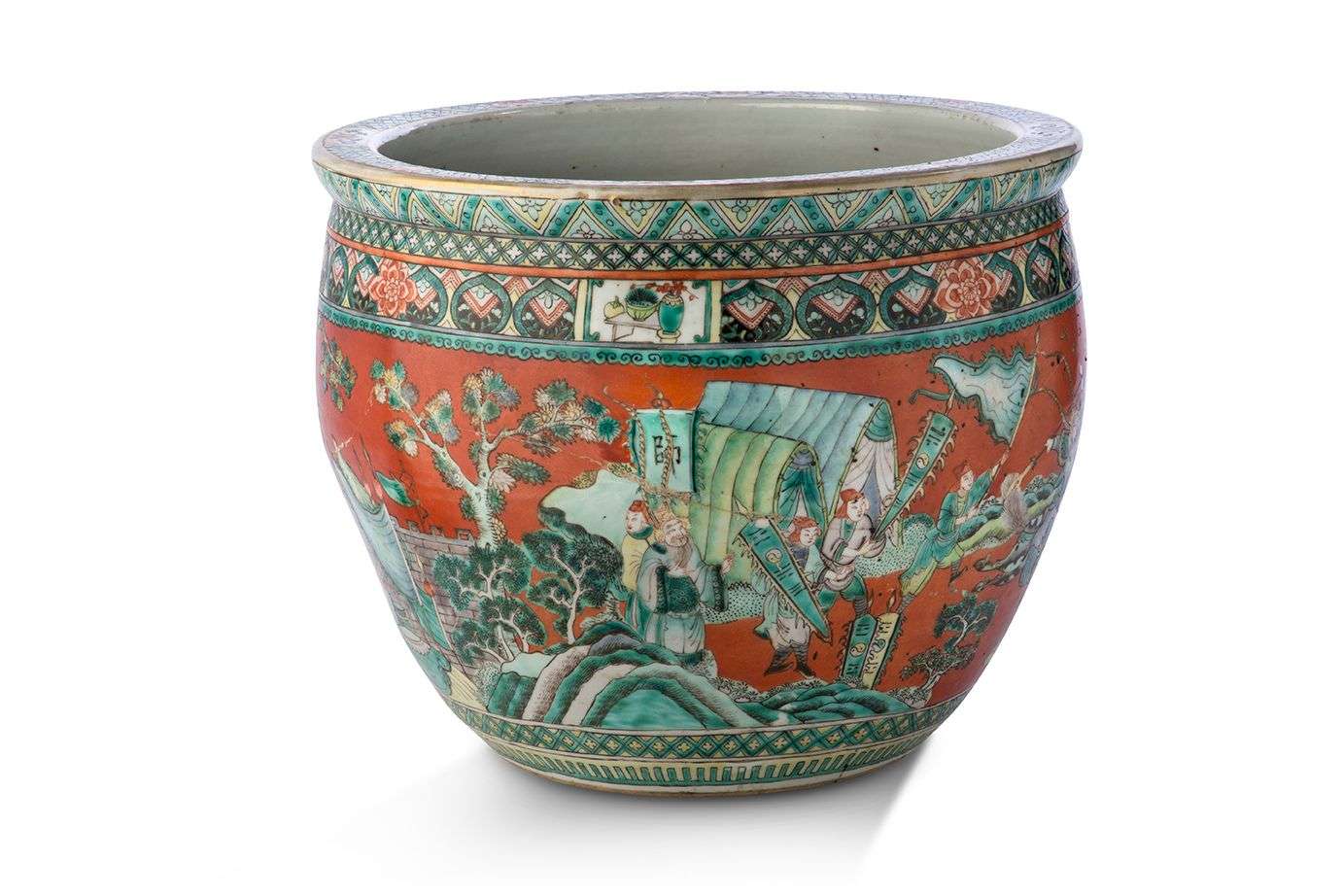 Porcelain aquarium with green family enamels on a red ground, the body decorated with a battle scene. The interior and background painted with fish among aquatic plants.