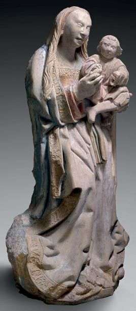 VIERGE À L'ENFANT Pierre calcaire et reste de polychromie d'origine H.: 110 cm - l.: 56 cm France (Bourbonnais) - Saint Aubin sur Loire Vers 1500 Manque une partie de l'oiseau et la main gauche de l'Enfant, légers accidents Marie occupe une place prééminente dans l'Eglise et son image est présente dès les premiers temps du christianisme. Parmi des types de représentation très divers, la Vierge de tendresse s'impose à partir du XIIIème siècle. La mère aimante, représentée debout, présente l'Enfant dans un geste calme et serein. Elle se substitue à la Vierge reine des représentations en majesté. Silhouette puissante et élégante, la Vierge de Saint - Aubin sur Loire porte Jésus sur le bras gauche conformément à la tradition. L'autre main, comme souvent en Bourbonnais, tient l'oiseau (mutilé) annonciateur de la Passion, qui lui sert d'attribut. Le visage allongé, aux yeux étirés en amande, à la bouche pulpeuse, au nez fort, revêt une expression énigmatique. Le front épilé haut, bombé et dégagé, reflète la mode aristocratique de la fin du XVème siècle. La longue chevelure, rejetée vers l'arrière, retombe sur les épaules en légères ondulations. Le visage est dépourvu de voile et de couronne. Peut-être a t il porté une couronne d'orfèvrerie, aujourd'hui disparue? Ces caractères définissent un courant stylistique propre au Bourbonnais, qui se retrouve dans la disposition des yeux (cf. sainte Madeleine de l'église saint Pierre de Montluçon), le front haut (cf. Vierge d'Olivet), la ligne du corps et le drapé du vêtement, qui conserve d'importantes traces de polychromie, rouges et bleues. Les étoffes épaisses et les plis amples et lourds enveloppent le corps. Le hanchement est peu marqué, la stature solide. Mais on devine l'avancée de la jambe droite, qui imprime à la base du drapé une belle tombée et un balancement des plis qui dégage la bordure du manteau. Ourlée de perles, elle porte une inscription gothique fine