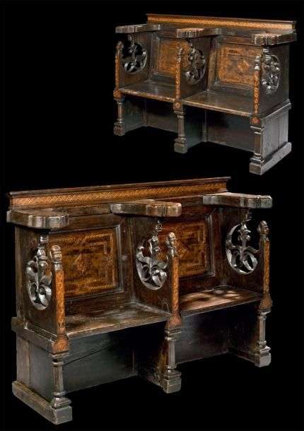 PAIRE DE STALLES Bois de noyer et bois de rapport H: 117 cm - L: 152 cm - P: 51 cm Italie (Florence) - XVème siècle Une assise remplacée, restauration en partie basse (colonnes) faisait partie d'un ensemble important Dans les églises, les stalles garnissent sur deux rangées les deux côtés du choeur. Enveloppées de panneaux de noyer massif sur trois côtés et montées sur des patins, ces stalles forment un siège assez bas, dont l'abattant se relève. Il présente alors "un appui attaché sous le siège même, comme la moitié d'un cul-de-lampe... sur lequel on n'est ni assis ni debout, mais seulement un peu appuyé par derrière, les coudes portant par devant sur une espèce de paumelle qui avance, soutenue par une... console" (Dictionnaire de Trévoux). L'esprit gothique perdure dans les belles parcloses ajourées d'une rose, dont les nervures vigoureuses s'épanouissent en fleurons et fleurs de lis. En vue frontale, colonnettes, pilastres et corniche structurent le meuble comme une façade d'architecture. Panneaux, pilastres et frise introduisent un effet coloré dans un décor géométrique produit par la technique de l'intarsio. Des formes ornementales découpées à la scie "forment des motifs ressemblant aux pièces d'un puzzle" (P.Thorton). Au bois de rapport de couleur très claire (le silio) s'ajoutent des filets de bois noirci. Les formes géométriques produites s'inspirent du Proche Orient. Elles s'appliquent sur de larges panneaux dès le début du quinzième siècle. On qualifie ce genre d'ouvrage "a la certosina". Sur le dossier, le dessin d' un double cadre se calque sur la forme géométrique du rectangle. Il est perturbé par le losange central qui imprime son mouvement sur les petits côtés, dont il casse l'ordonnance. De petits losanges naissent de l'imbrication des registres. Ces figures précèdent les ornements figuratifs mais continueront d'être employées par des incrustateurs habiles. Ils travaillent à Ferrare, Modène ou Floren