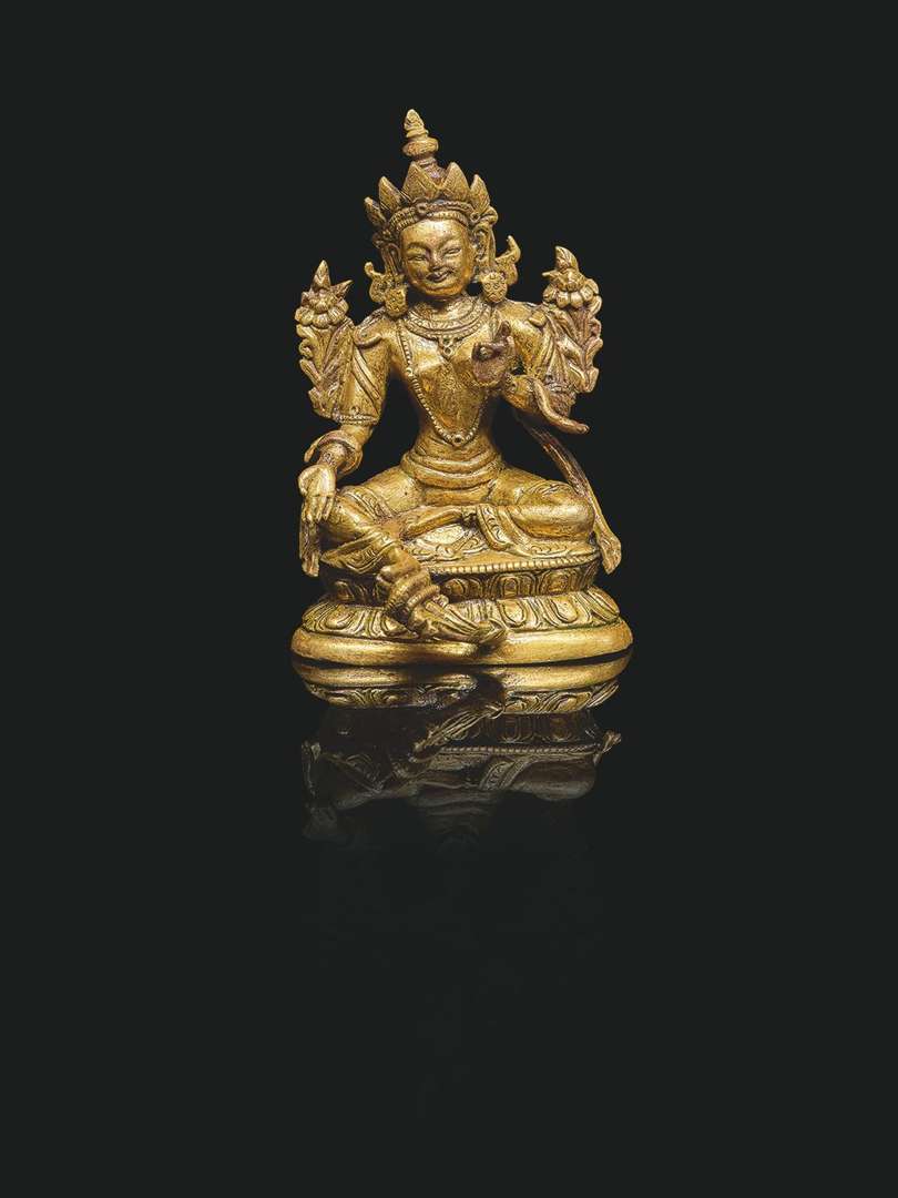 The bodhisattva seated in lalitasana on a double lotiform base, her right foot resting on a lotus flower, her right hand in varada mudra and her left hand in refuge mudra, with two lotus stems blossoming on her shoulders. Unsealed base.