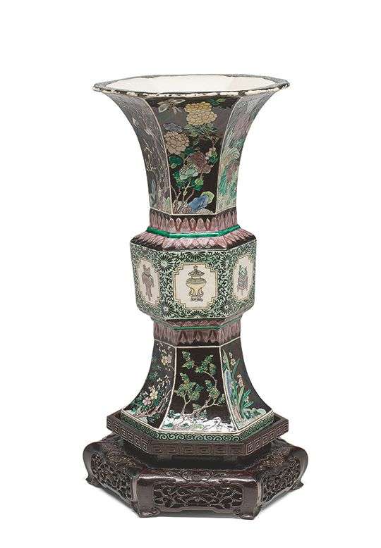 Hexagonal form, the body decorated with reserves showing the twelve traditional flowers and the "Hundred Antiques". With its carved natural wood base.