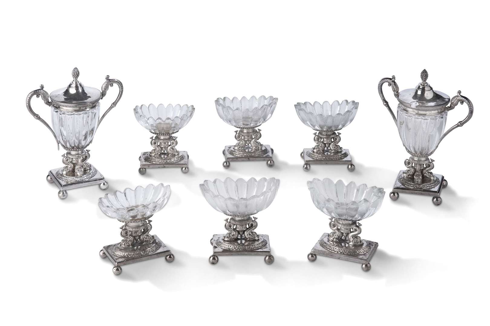 in silver. Cut-glass bowls on bases with leaning dolphins.