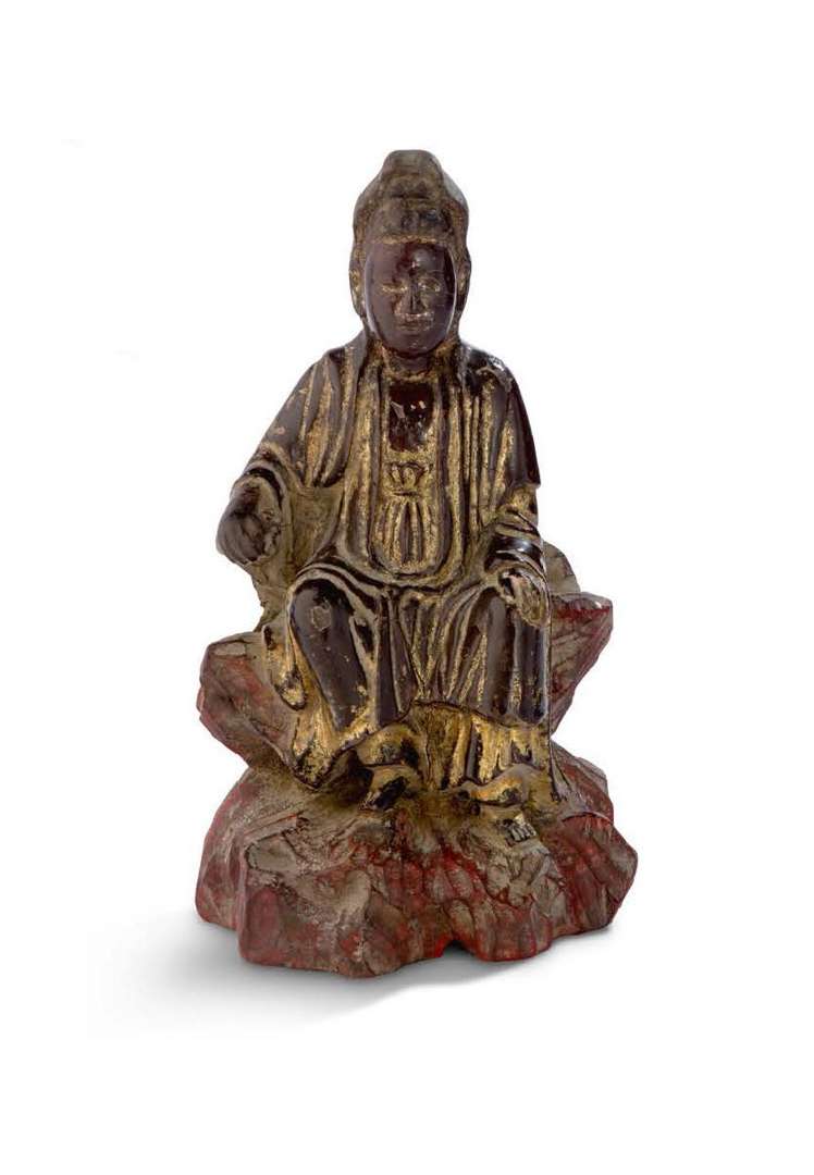 Red-brown lacquered wood statuette with traces of gilding depicting a bodhisattva seated in pralambapadasana on a rocky throne.