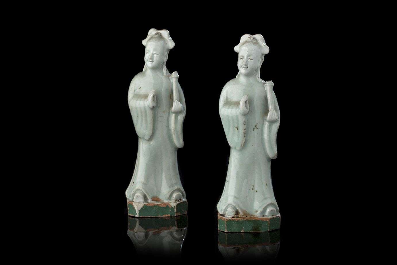 Taoist immortals standing on small quadrangular bases, wearing long robes and bonnets, holding scepters in their left hands.