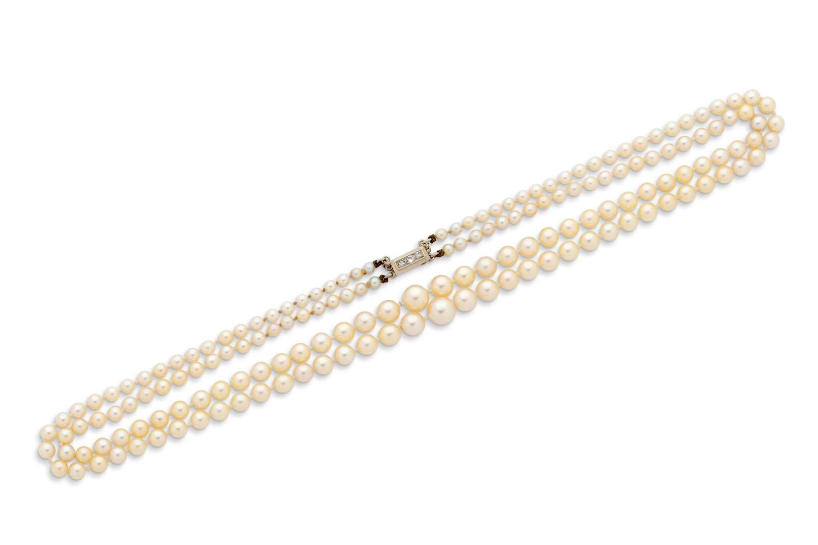 Pearl necklace Double strand of cultured pearls Clasp with brilliant-cut diamonds, 18k (750) gold L. : 44.5 cm approx. - Pb. : 28.5 g