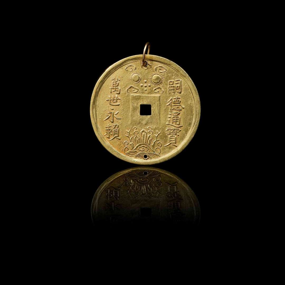 Obverse with the sentence Tu Duc thông bao / Van the vinh lai ("Tu Duc's current currency / Ten thousand generations will have perpetual confidence") with the sun and moon, the five planets and five clouds at the top and three mountains emerging from the waves, coral branches at the bottom. The reverse features a poem.