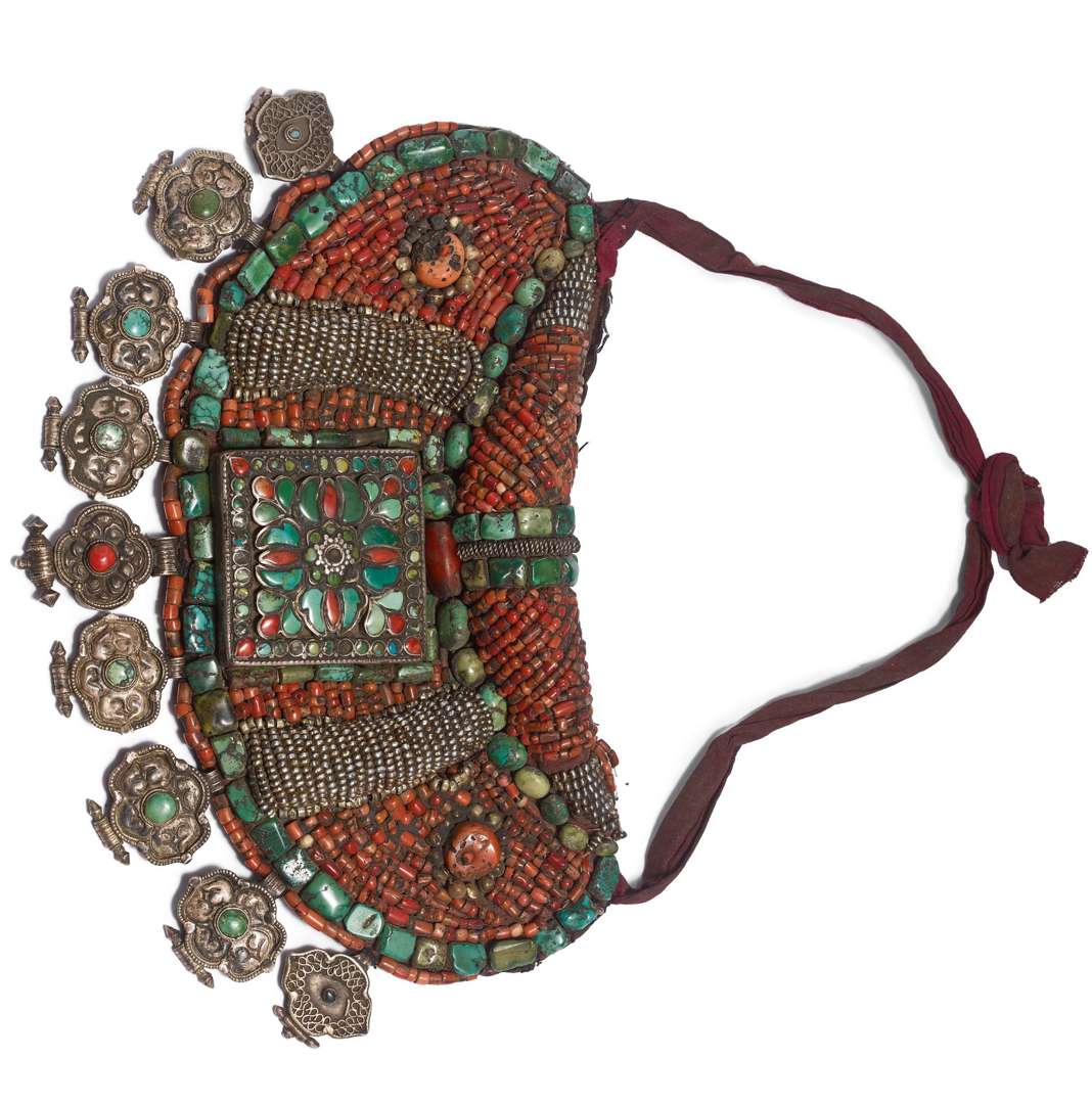 The center with a square medallion, surrounded by dense beading in coral, silver beads and turquoise cabochons, and highlighted by nine ga'u-shaped pendants.