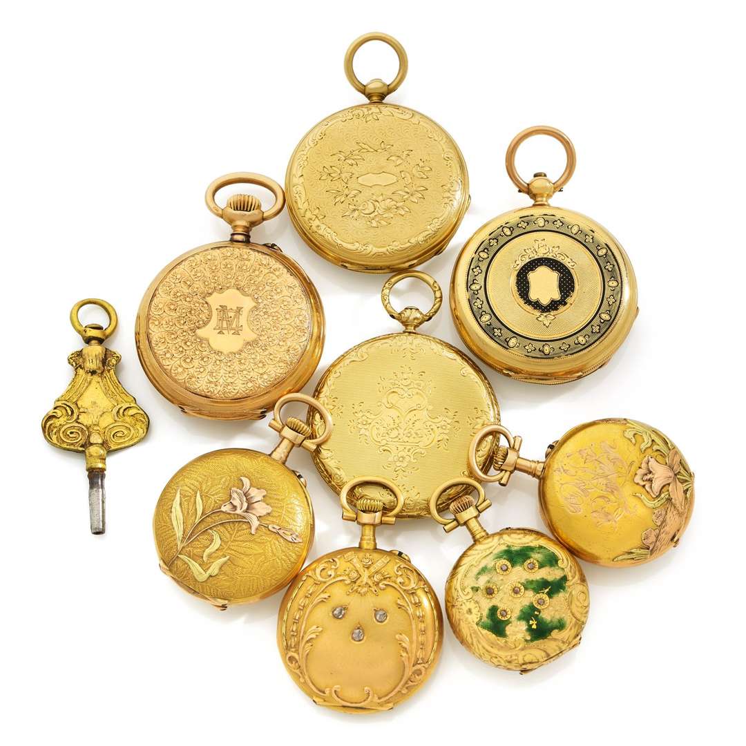 Movements: with key or crown windings, all accompanied by a Rococo-style scroll-motif watch key