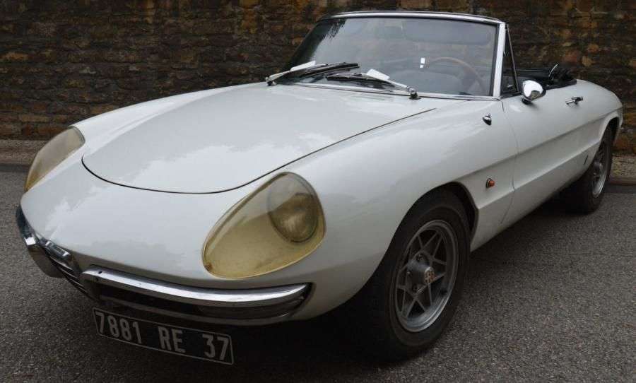 1969 - Alfa Roméo Spider 1750 Veloce Le Spider Duetto signé de la main du maitre italien Pininfarina est présenté en 1966 et vient succéder aux modèles mythiques sortis quelques années avant comme la Giulietta Spider ou en plus tard la Giulia. D'une ligne novatrice, ce modèle donne un élan de modernisme à la marque milanaise. En effet, si l'architecture du Duetto reste classique, ses lignes sont réellement novatrices avec des flans creusés et un arrière recourbé en forme d' «osso di seppia» ou «os de seiche» en français. A la suite d'un concours, elle est baptisée Duetto. L'appellation n'est pas retenue officiellement sur les carrosseries même si elle restera cependant utilisée dans le langage commun. Le Spider 1600 est d'abord motorisé avec le 1600 de la Giulia. En janvier 1968, le Duetto cède la place à la 1750 Spider Veloce, modèle à la carrosserie identique mais équipé d'un moteur de 1800 cm3. Quelques mois plus tard est lancée une version plus économique, baptisée Spider 1300 Junior. Avec 118 chevaux, le Spider 1750 Veloce s'offre 180 km/h en vitesse de pointe. Le 4 cylindres propose de belles montées en régime, il est associé à une boite de vitesse à 5 rapports. La voiture innove techniquement: à l'avant, les roues sont indépendantes avec des triangles superposés, des ressorts hélicoïdaux, des amortisseurs télescopiques et une barre anti-roulis. A l'arrière, on trouve un essieu rigide, avec des ressorts hélicoïdaux et des amortisseurs télescopiques coaxiaux. A l'arrière, une barre anti-roulis est montée pour la première fois sur la version 1750 en 1968. Le levier de vitesse recourbé vers le volant autorise une conduite plus sportive. A l'intérieur, Le Duetto est équipé d'un tableau de bord en métal peint couleur carrosserie. Les sièges, munis de dossiers réglables sont en skaï noir. La capote est de couleur noire quelle que soit la teinte de la carrosserie. Elle est relativement facile à utiliser. Dés