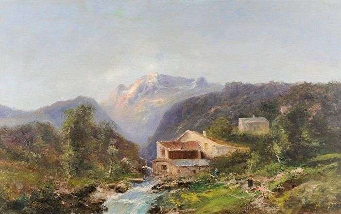 Paysage de montagne Huile sur toile, signée en bas à droite 73 x 117 cm Rentoilée