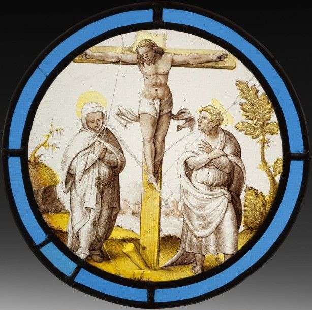 VITRAIL rondelle en grisaille et jaune d'argent représentant le Calvaire: le Christ entre la vierge et Saint-Jean. France XVIème siècle D: 24 cm Casses réparées au silicone.