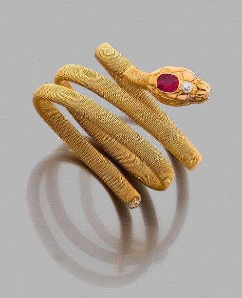 Bracelet manchette en or jaune 18k stylisant un serpent serti sur la tête d'une pierre rouge et d'un diamant de taille ancienne. Poids brut: 48.4 gr A diamond, red stone and yellow gold bracelet.