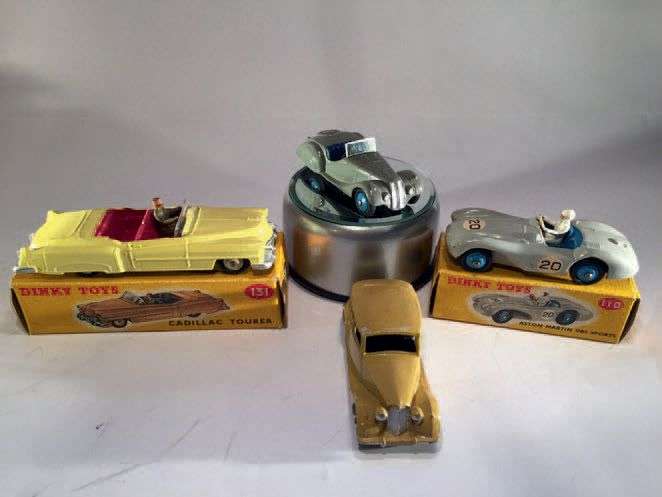 Lot de 4 miniatures DINKY TOYS comprenant: 1 Cadillac Tourer, en boite réf 131, très bon état, 1 Aston Martin DB 3 Sports, en boite réf: 110, très bon état, 1 Triumph Berline, sans boite réf: 40B, très bon état, 1 Frazer Nash, sans boite réf: 38A, très bon état
