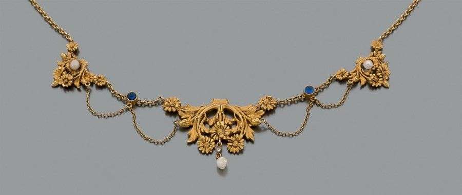 Collier «draperie» en or jaune 18k ciselé de motifs fleuris rehaussés de saphirs cabochons et de perles.
