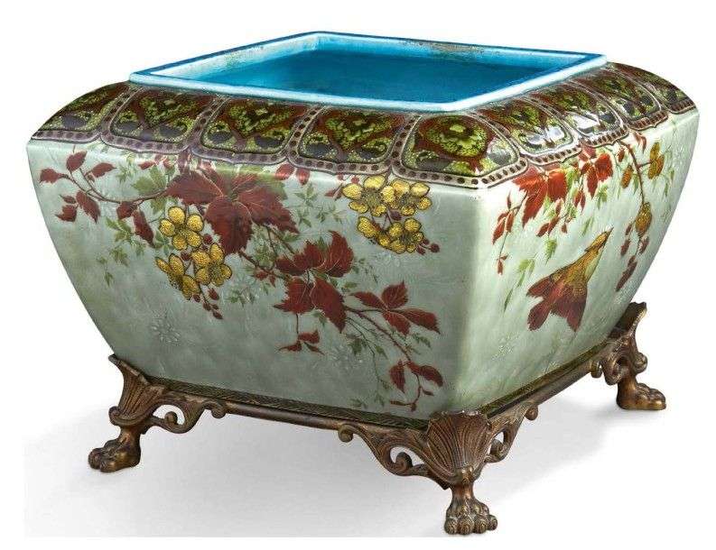 Jardinière quadrangulaire en céramique émaillée polychrome et réhauts d'or à décor d'oiseaux sur fond vert céladon et reposant sur un piètement en bronze doré à pattes de lion.