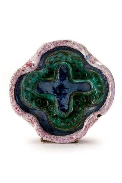 Coupe à bord rentrant, pourtour rosé, intérieur décoré de deux croix verte et bleue