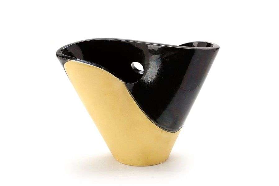 Paire de vases doubles à émail jaune satiné et noir brillant, le col en forme de huit à double entrée