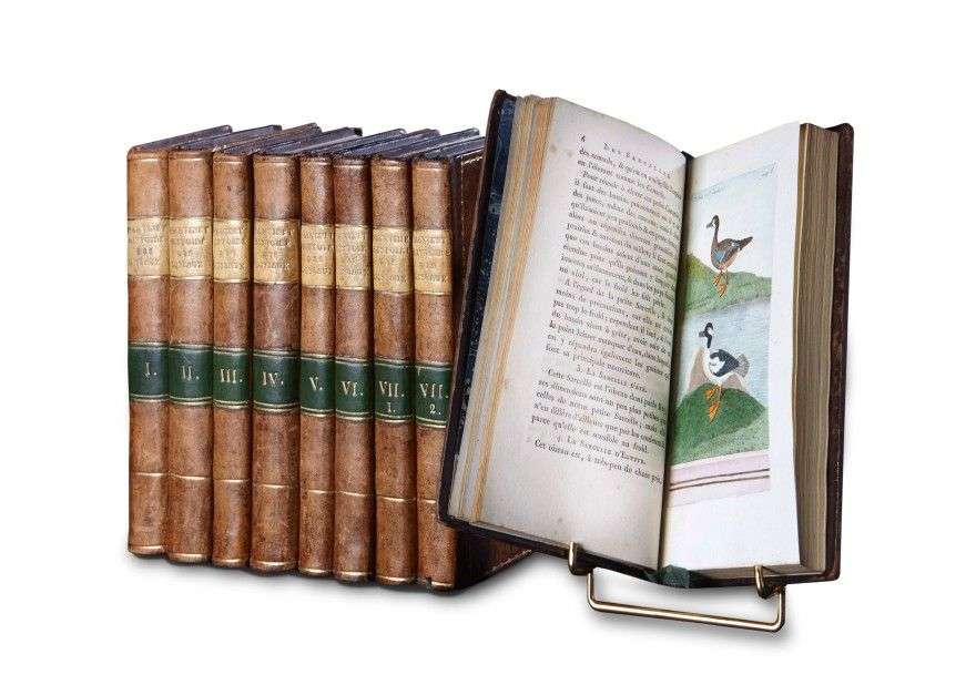 Paris, chez l'Auteur| Royez| Lami| le Roi| La vve Duchêne, 1787-1796| 8 tomes reliés en 9 volumes (7-1 et 7-2), veau raciné, dos lisse, pièces de titre blondes et de tomaison vert foncé, chainette dorées d'encadrement des plats, tranches jaunes (reliure de l'époque) T.1: 8, [4], 16, 16, [4], [162] pp. // T2: 12, 8| [216] pp. // T3: [8], 8, 4| [176] pp. // T4: [4], 4, 8, 8| [234] pp. // T5: [4], 8, 4| [124] pp. // T6: [4], 3, [1 bl.], 8, 4, [116] pp. // T 7-1: [8], 12, 20| [148] pp. // T 7-2: [4], [192] pp. // T8: [8], 8, 8| [186] pp. et en tout, 480 planches gravées hors-texte en couleurs sur un papier fort blanc, bleu clair ou vert clair, dont 9 titres, 8 frontispices allégoriques et 463 planches d'oiseaux, toutes les planches sont finement aquarellées et souvent gommées et certaines sont même rehaussées à l'or.