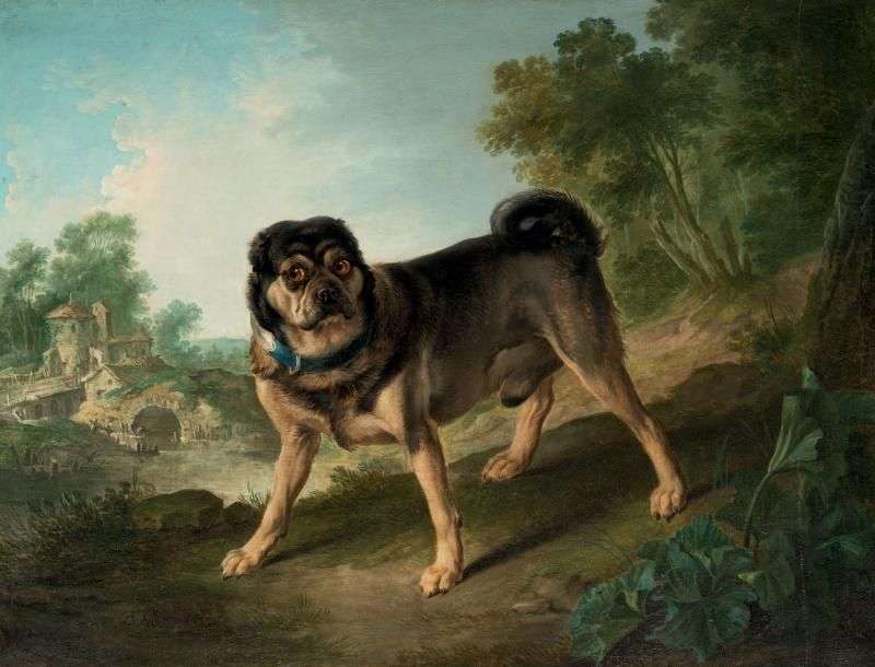 Huet fut très influencé par l'art de Desportes comme on le voit ici. Notre tableau représente un jeune chien de type carlin, une race importée d'Asie et très appréciée dès le XVIIIe siècle par l'aristrocratie française. On sait que Louis XV et Madame de Pompadour en possédaient et le peintre Jean-Baptiste Oudry en avait également fait le sujet principal de son amusant portrait de carlin au collier rouge, conservé au Palais des Beaux-Arts de Lille.