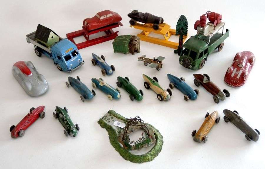 Lot divers comprenant petits camions CIJ mécanique – voitures de course en plomb dont DINKY TOYS – Voiture des Records – TECHNI-FRANCE 1946.