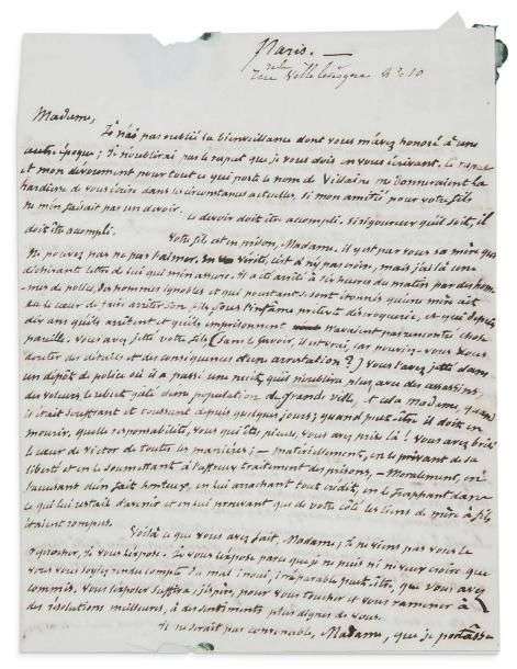 [...] «Votre fils est en prison, Madame, il y est par vous sa mère qui ne pouvait pas ne pas l'aimer... Il a été arrêté à six heures du matin par des hommes de police, des hommes ignobles et qui pourtant se sont étonnés qu'une mère ait eu le coeur de faire arrêter son fils, sous l'infâme prétexte d'escroquerie, et qui depuis dix ans qu'ils arrêtent et qu'ils emprisonnent, n'avaient pas rencontré chose pareille... Il a passé une nuit qu'il n'oubliera plus, avec des assassins, des voleurs, le rebut gâté d'une population de grande ville... Vous avez brûlé le coeur de Victor de toutes les manières - matériellement, en le privant de sa liberté et en le soumettant à l'affreux traitement des prisons - moralement, en l'accusant d'un fait honteux, en lui arrachant tout crédit, en le frappant dans ce qui lui restait d'avenir... Ne vous repentirez-vous pas un jour d'avoir risqué autant que vous risquez ? Et n'est-ce rien quand vous auriez pu tout étouffer du scandale affreux qui menace... N'est-ce rien que de s'aliéner le coeur d'un fils qui vous aimait qui a pu avoir des torts vis-à-vis de vous, mais qui vous aimait ? [...] Est-ce donc un préjugé que la solidarité du nom qu'on porte ? Et l'opinion ne vous condamnerait pas, vous une mère ! Plus cruellement que le fils que vous auriez fait condamner je ne vois que malheur pour vous dans les conséquences de votre démarche. Je ne viens pas de vous demander de renoncer à une poursuite qui personnellement me désole.