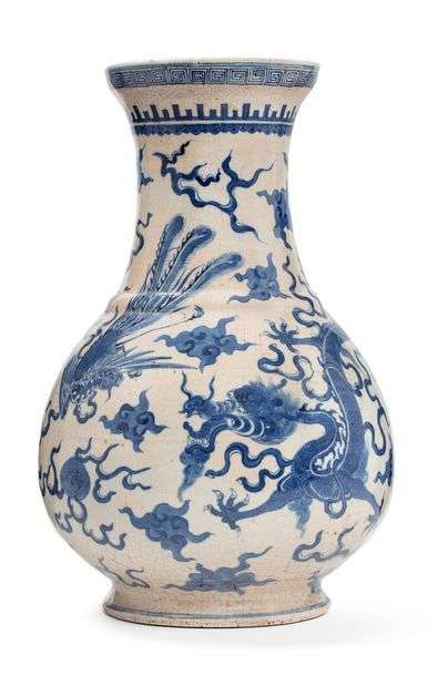 Vase balustre en porcelaine et émail craquelé, à décor en bleu de dragons et phénix parmi des nuages. Marque apocryphe Kangxi.