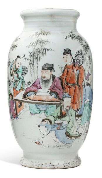 Grand vase balustre en porcelaine et émaux de la famille rose, à décor de sages dans une forêt de bambous en grisaille, l'un faisant une partie de go, et un autre jouant d'un instrument à cordes, accompagné d'une calligraphie.